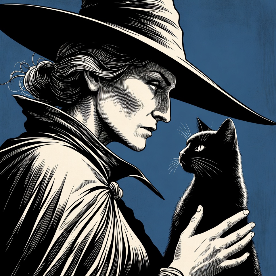 An illustration of a woman dressed as a witch with a wide-brimmed black hat and flowing cape holds a black cat. She has her blonde hair in a bun and gazes sideways at the cat on a blue background. The artwork features bold black lines and detailed shading.
