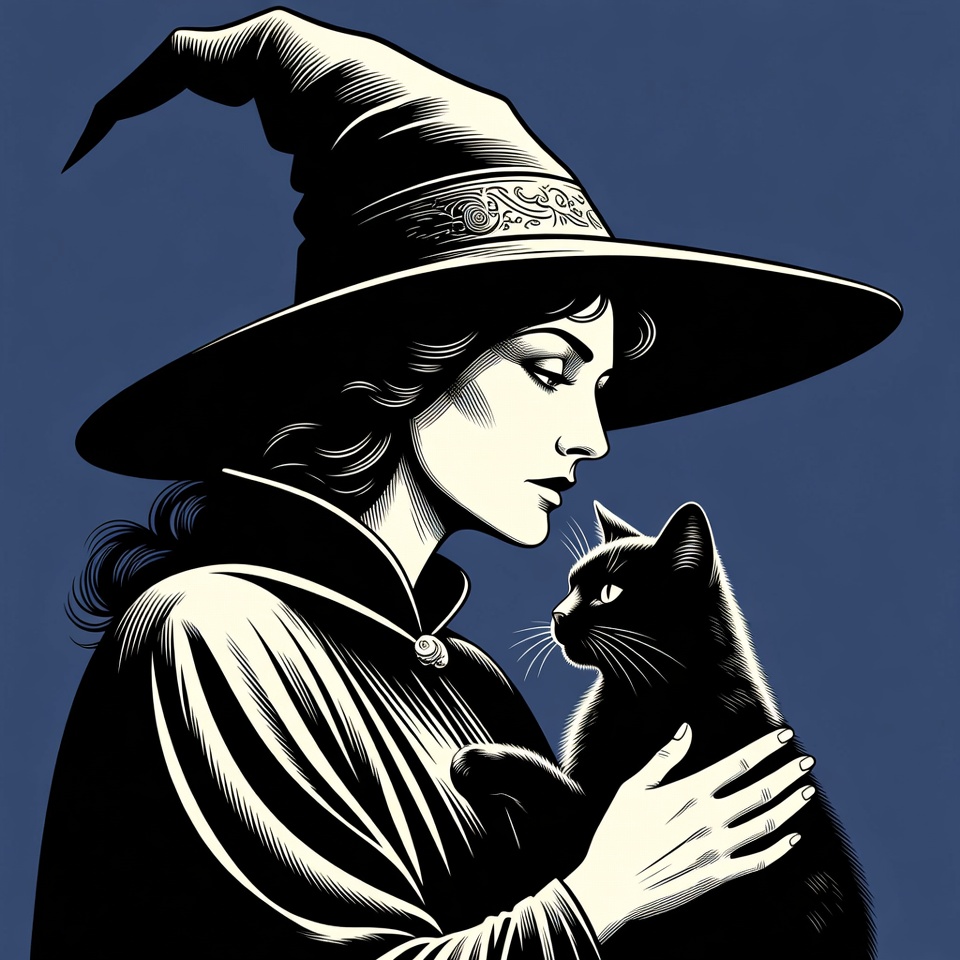 A detailed black and white illustration depicts a woman in a pointed witch hat and long dark coat holding a black cat close to her face. She has flowing hair and a serene profile view against a deep blue background. The cat gazes at her with yellow eyes.