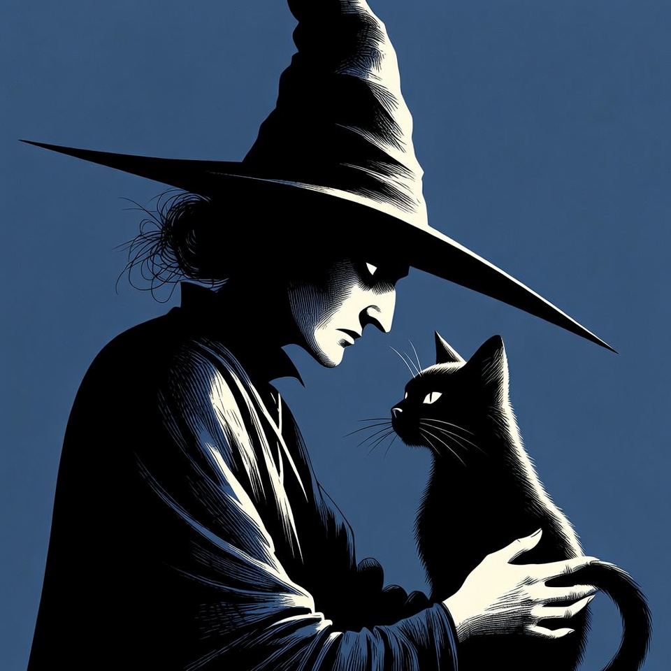 A stylized black and white illustration of a witch with a tall pointed hat and flowing hair holds a black cat close to her face. She wears a long dark robe and gazes intently at the cat's glowing eyes. The image features high contrast on a deep blue background.