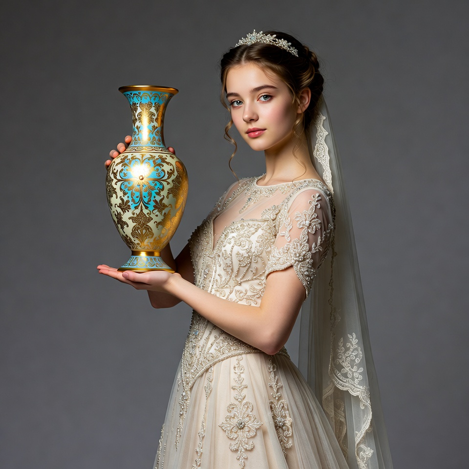 blue vase, bridal portrait, decorative porcelain, elegant dress, gold vase, gray background, holding vase, lace dress, ornate vase, short sleeves, tiara, turquoise vase, updo hairstyle, veil, wedding dress, wedding fashion, white gown, woman, young woman, bride