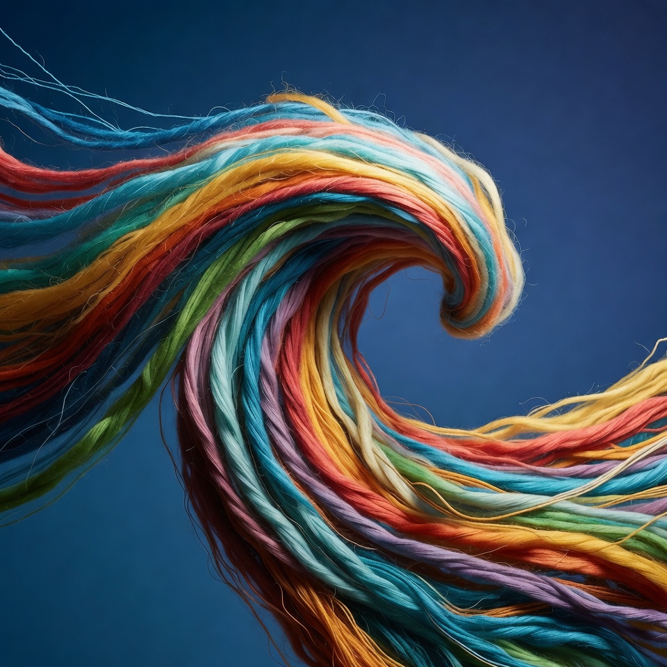 A vibrant wave-shaped bundle of multicolored yarn twists dynamically against a deep blue background. The yarn features shades of red, orange, yellow, green, blue, and purple, creating a fluid, oceanic form. Strands flow smoothly, highlighting texture and color variety.