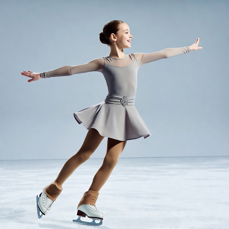 A young girl with brown hair in a bun performs a figure skating pose on ice. She wears a gray sheer long-sleeve leotard with a matching short skirt and beige tights. Her arms are extended gracefully, and she stands on white ice skates against a blue background.