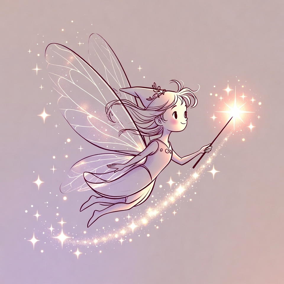 A cute illustrated fairy girl with large wings holds a sparkling magic wand. She wears a pointed hat and dress, surrounded by floating stars and sparkles. The artwork features soft line art on a light purple background.