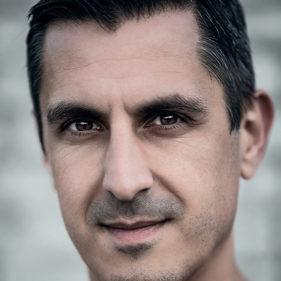 A man with neatly combed dark hair and subtle gray at the temples stares directly at the camera. His face features prominent eyebrows, brown eyes, and a slight smile. The portrait is set against a plain gray background.