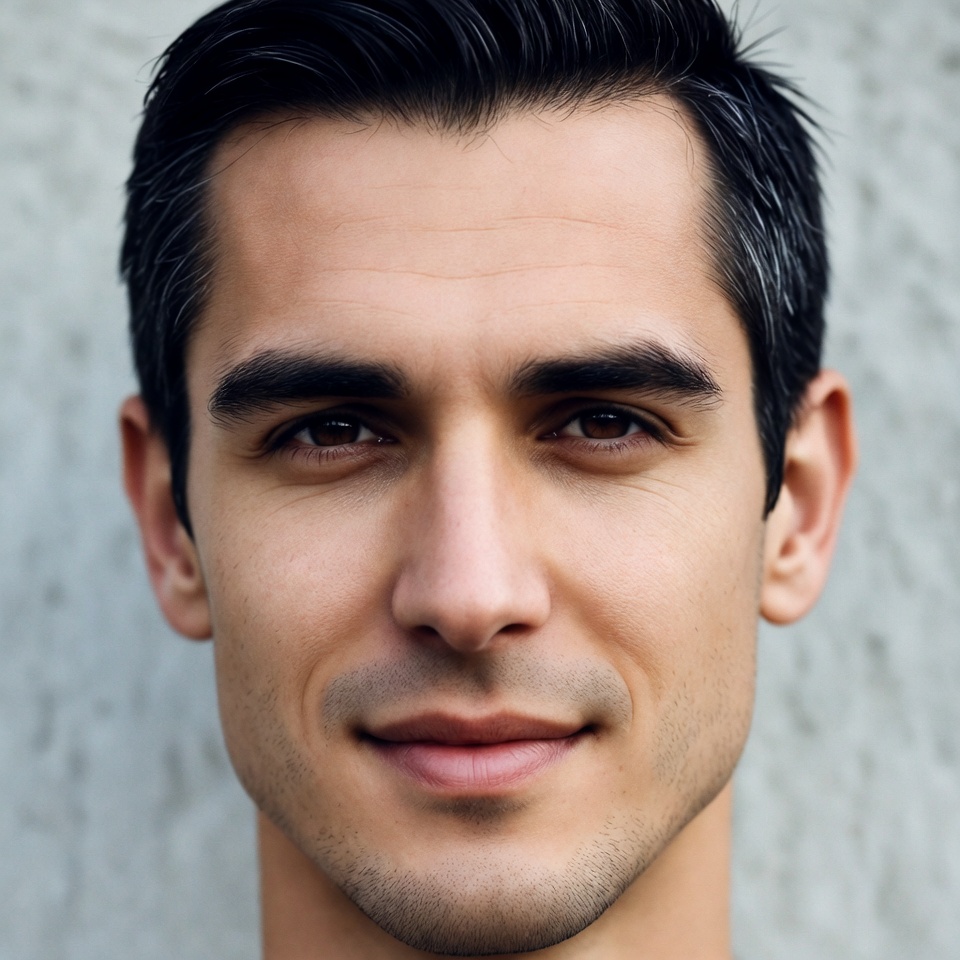 A young man with neatly styled dark hair and prominent cheekbones smiles at the camera. He has warm brown eyes and smooth skin, posed against a plain gray background. His expression is confident and approachable.