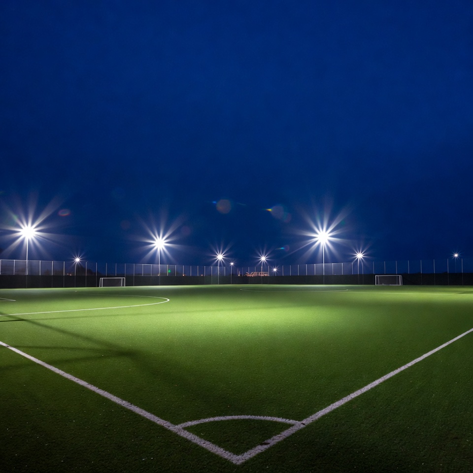 artificial grass, chain link fence, corner flag, dark sky, empty field, floodlights, football pitch, goalposts, green turf, lens flare, lit field, night, nighttime sports, outdoor sports, soccer goals, soccer stadium, sports field, stadium lights, white lines, soccer field