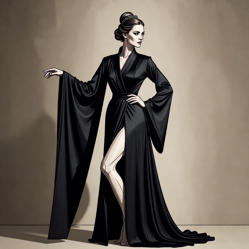 A stylized illustration depicts a woman with pale skin, dark hair in an updo, and dramatic makeup posing confidently. She wears a sleek black satin gown with wide sleeves, a high slit revealing one leg, and stands barefoot on a beige background. Her hand rests on her hip while the other extends gracefully.