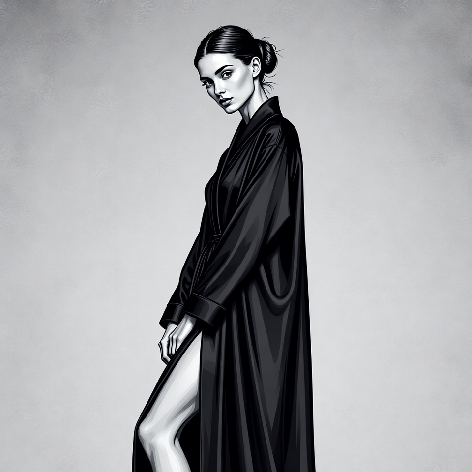 A digital illustration of a woman with dark hair in a bun stands sideways wearing a long black silk robe with a high slit revealing her leg. She has a serene expression and fair skin, posed elegantly against a plain gray background. The artwork is rendered in black and white with subtle shading.