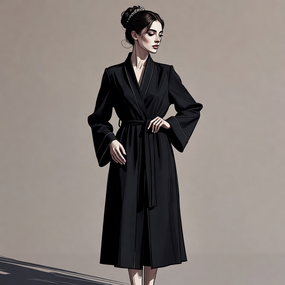 A woman with dark hair styled in an updo adorned with a hair accessory stands gracefully wearing a long black silk robe with a belt tied at the waist. The robe features a V-neckline and wide sleeves, and she poses with one hand on her hip against a beige background. Her expression is poised and serene in this detailed digital illustration.