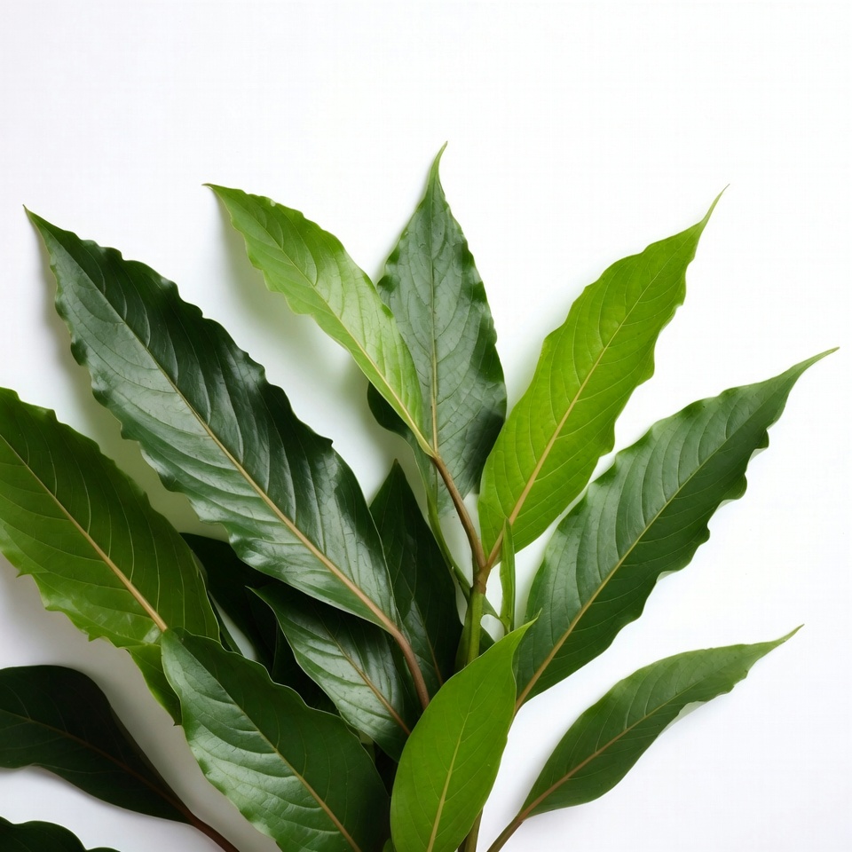 A cluster of vibrant green leaves with pointed tips and prominent veins is arranged on a plain white background. The leaves feature smooth edges and varying shades of green, with some stems visible. They are laid flat, creating a natural botanical display.