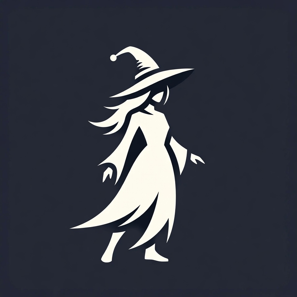 A white silhouette illustration of a witch stands on a dark background. She wears a wide-brimmed pointed hat with a tassel, long flowing hair, and a billowing dress with extended sleeves. Her pose is dynamic with one arm outstretched and skirt trailing behind.
