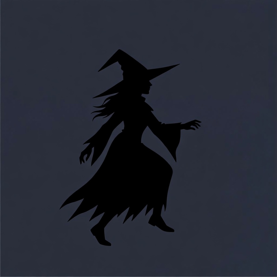 A black silhouette of a witch with a tall pointed hat dances on a dark blue background. She wears a flowing dress with wide sleeves and long hair, captured in a dynamic walking pose with one foot raised. The illustration features sharp, jagged edges for a spooky effect.