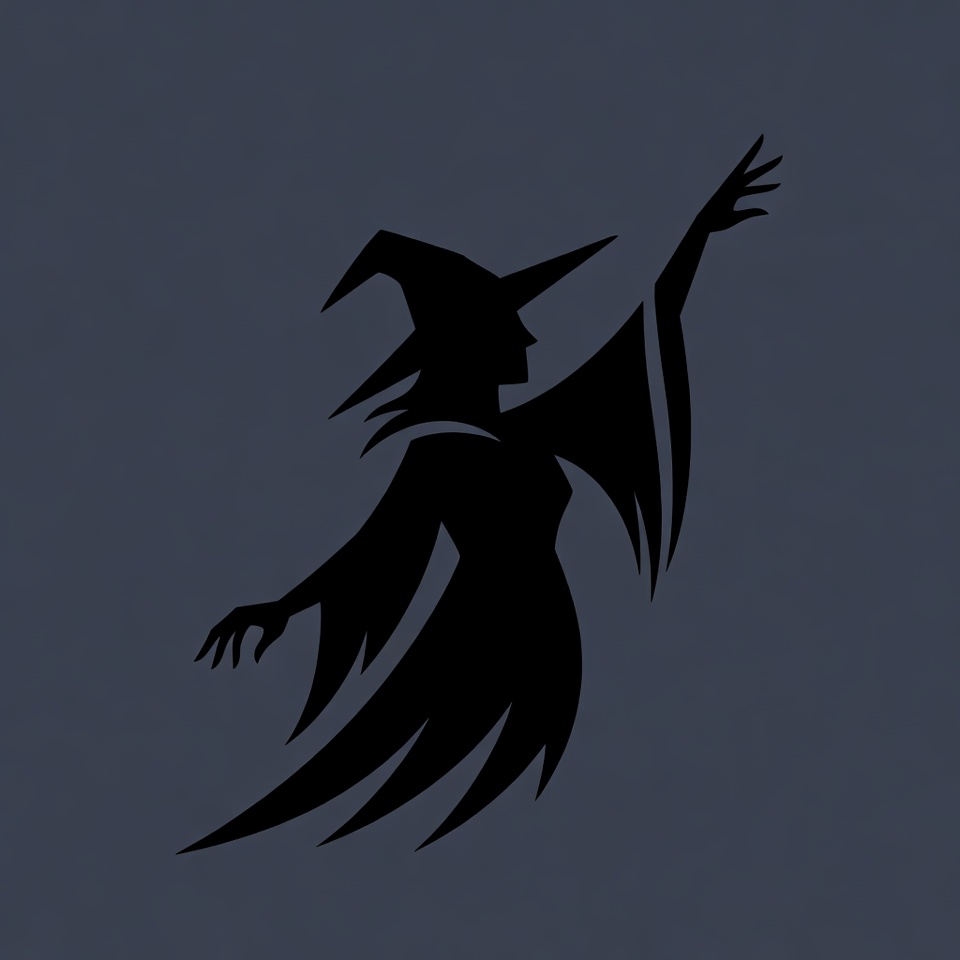 A black silhouette illustration of a female witch stands against a dark blue background. She wears a tall pointed hat and flowing cape-dress with outstretched arms and hands raised as if casting a spell. The design features sharp, dynamic lines emphasizing movement.