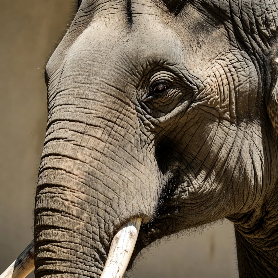 A close-up view of an elephant's head features wrinkled gray skin, a large ear, and long white tusks. The elephant's eye is visible, gazing sideways against a blurred beige background. Fine hairs cover parts of the trunk and ear.