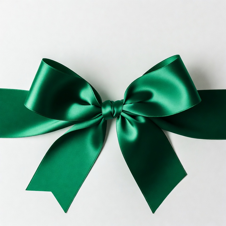 A large green satin ribbon forms a prominent bow on a plain white background. The glossy fabric features neatly folded loops and dangling tails. The bow is centered and isolated for versatile use.