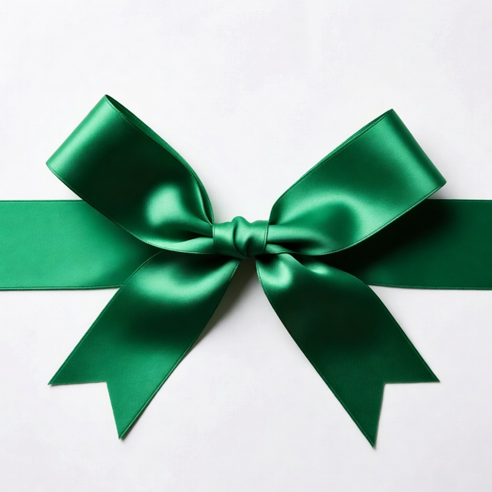 A large green satin ribbon forms a prominent bow with long tails draped over a plain white background. The shiny fabric reflects light, highlighting its smooth texture and vibrant emerald color. The bow is centered and isolated for a clean, versatile presentation.