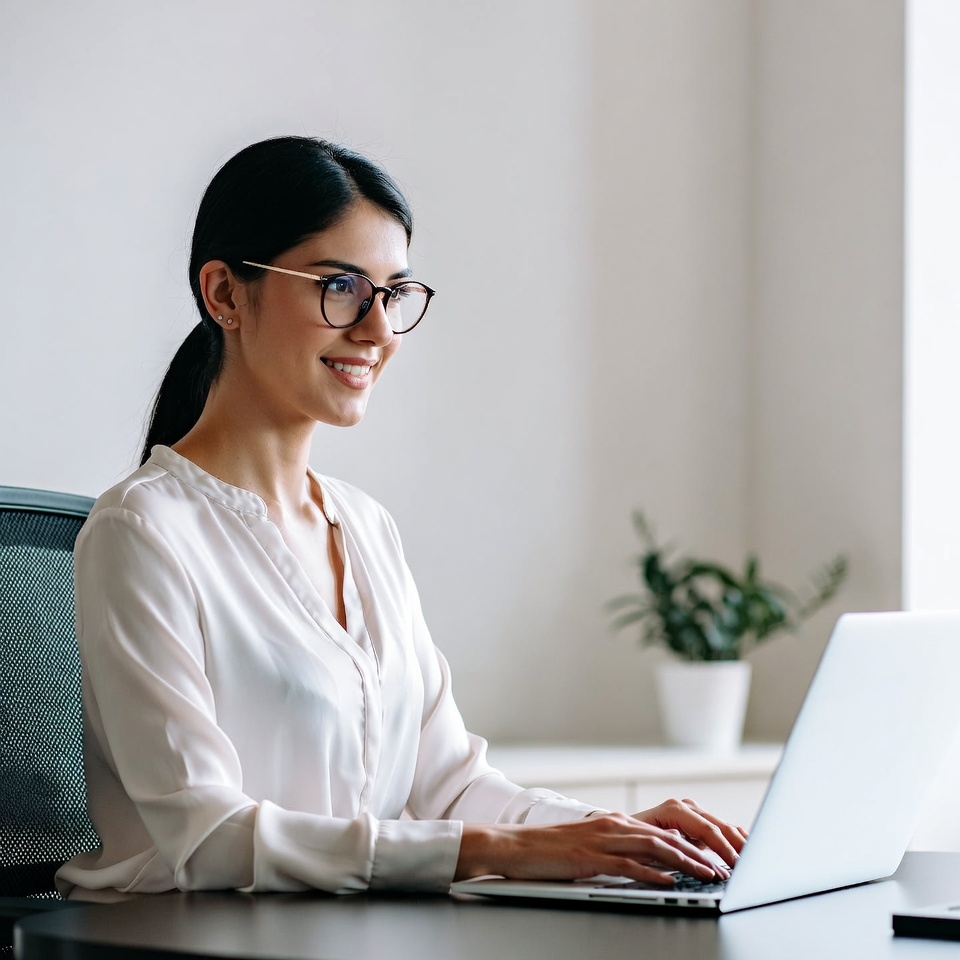 A young Asian woman with long dark hair pulled back sits at a desk typing on a white laptop. She wears thin gold-framed glasses, a white blouse, and smiles while looking to the side. The modern office features a green potted plant, large window, and black office chair.