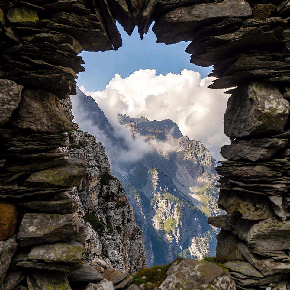 alpine landscape, blue sky, clouds, cloudy sky, dramatic landscape, frame view, green slopes, jagged rocks, mist, mossy stones, mountain range, nature, outdoor view, rock arch, rocky peaks, scenery, stone wall, stone window, valley, window frame, mountains