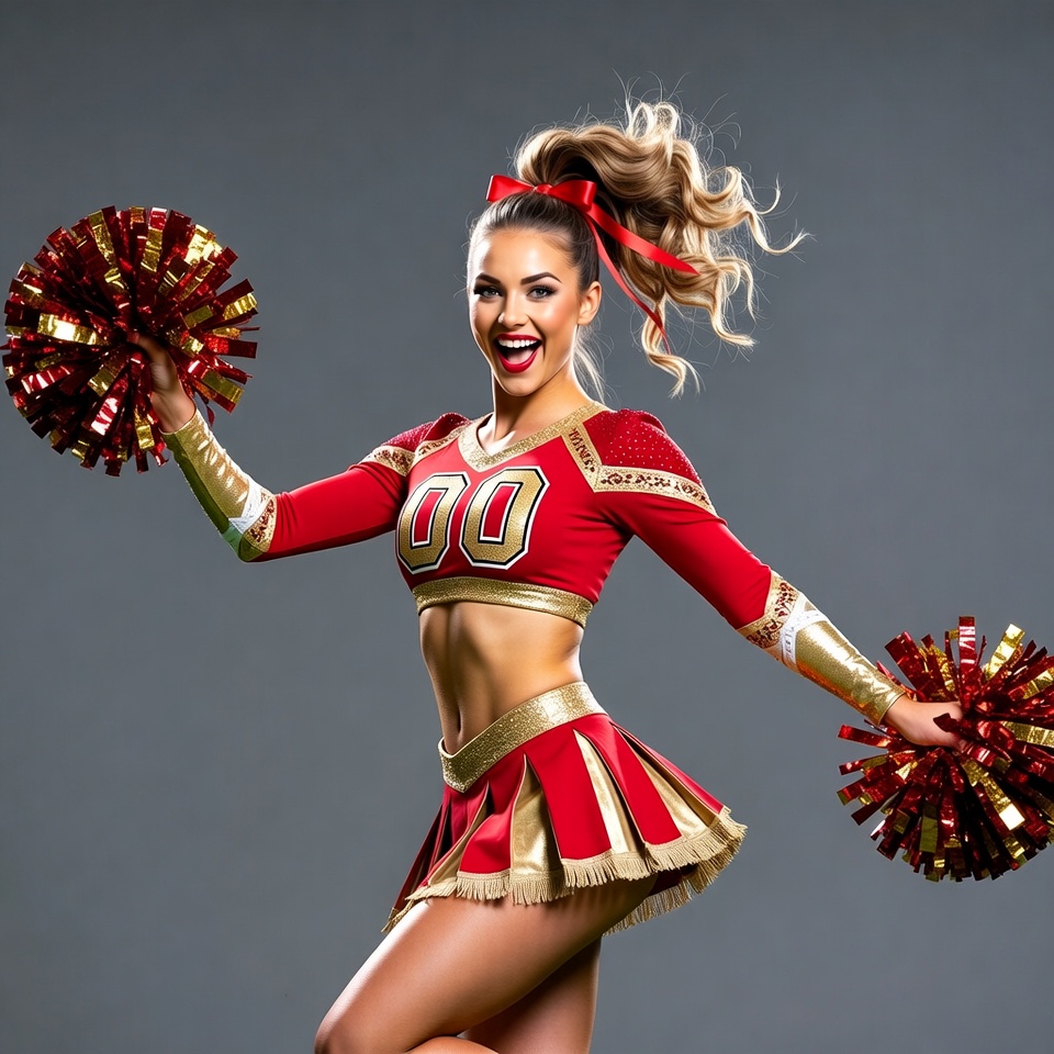 White, athletic build, blonde hair, cheer skirt, cheerleading, crop top, energetic, female, gold accents, gray background, hair bow, jumping pose, long hair, number 00, pom poms, red uniform, smiling, sportswear, woman, cheerleader