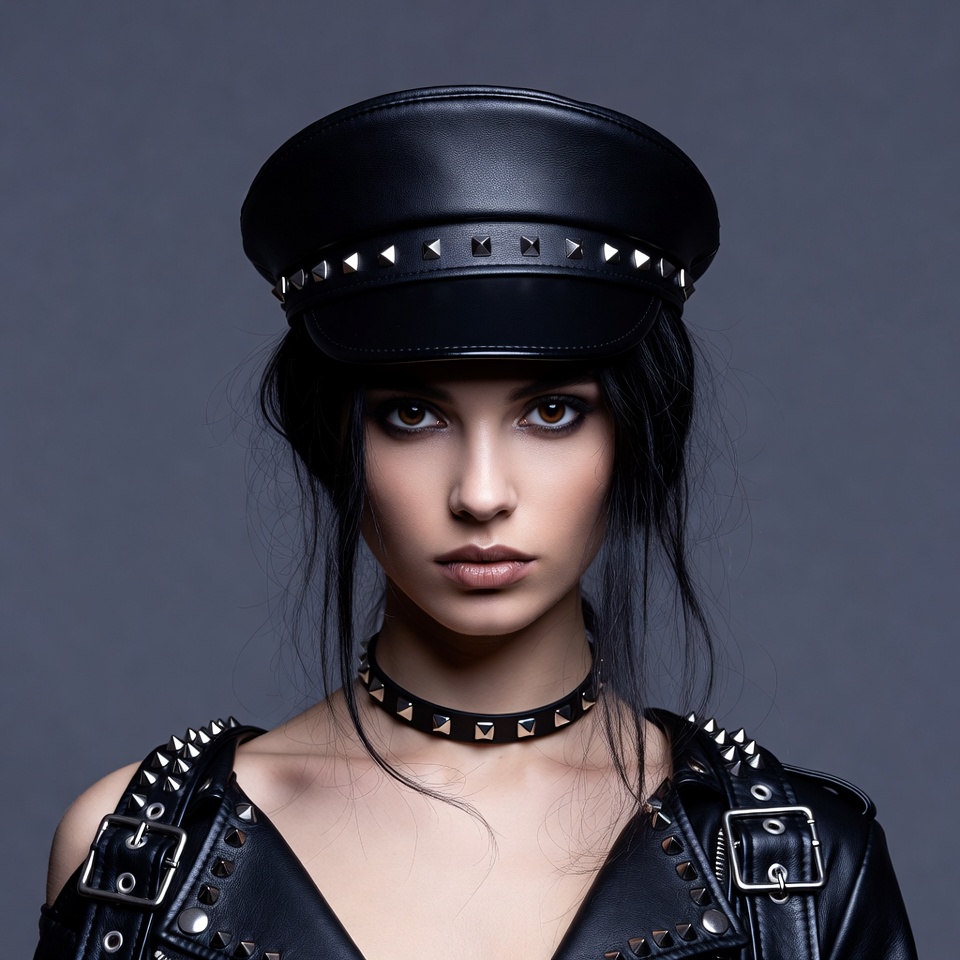 A young woman with dark updo hair wears a black leather peaked cap adorned with metal studs. She has a choker necklace with studs and an off-shoulder black leather jacket covered in studs. She gazes directly at the camera against a plain gray background.