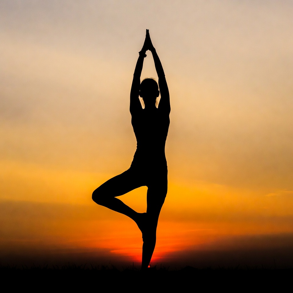 A silhouette of a woman performs the tree yoga pose at sunset. She stands on one leg with hands pressed together overhead against a vibrant orange and purple sky. Her figure is dark against the colorful horizon and grassy foreground.