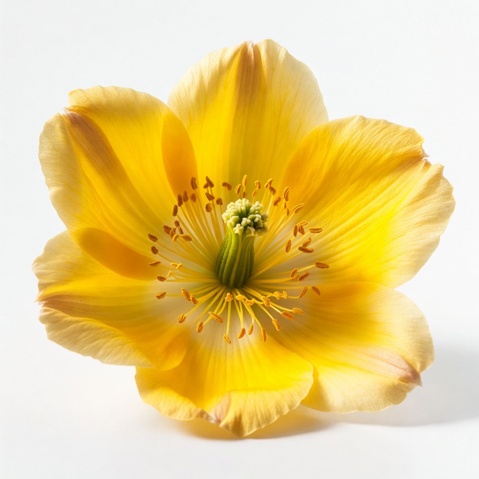 bloom, botany, closeup, floral, flower, green center, isolated, macro, nature, petals, stamens, vibrant, white background, yellow petals, yellow flower