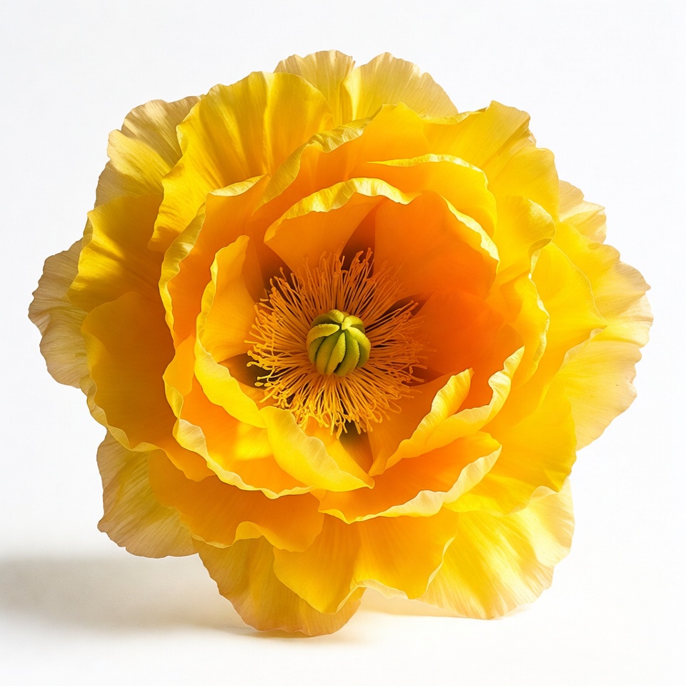 bloom, botany, close-up, floral, flower, fresh flower, green center, isolated background, nature, orange stamens, petals, poppy flower, ruffled petals, vibrant, white background, yellow flower, yellow poppy