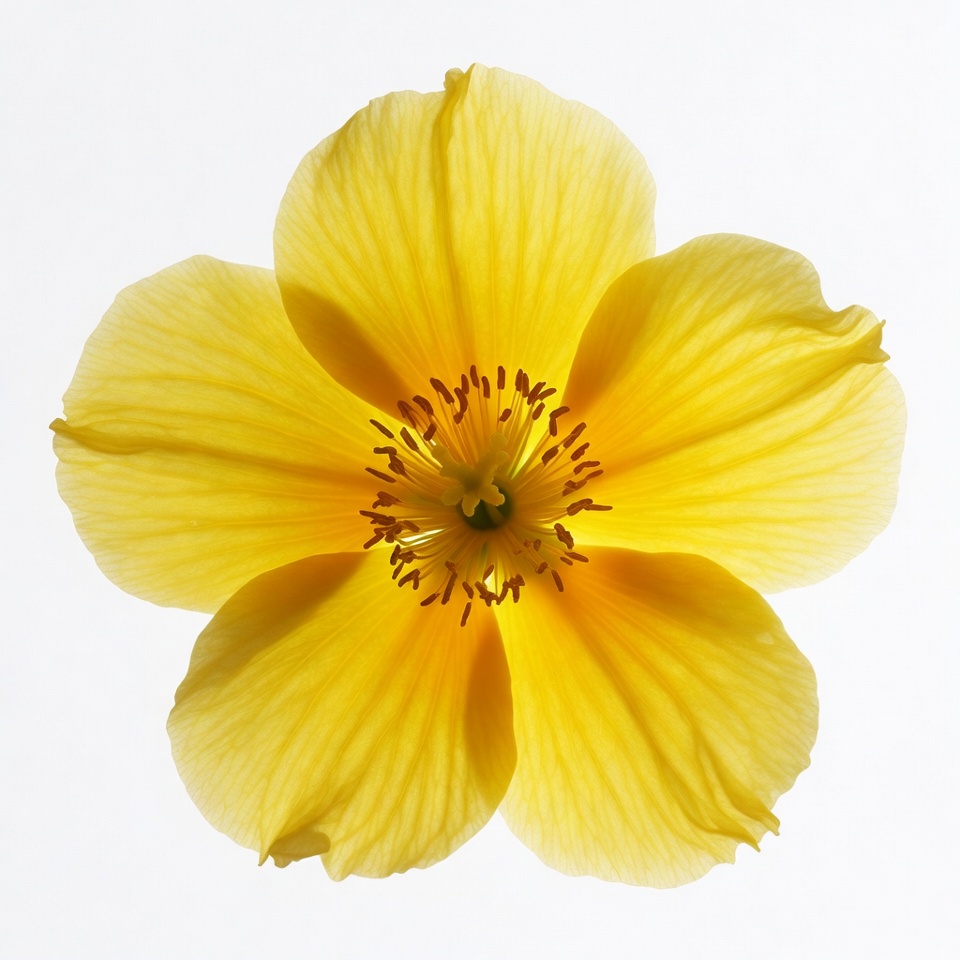 bloom, botany, closeup, five petals, floral, flower, flower center, isolated flower, nature, petals, stamens, vibrant yellow, white background, yellow petals, yellow flower