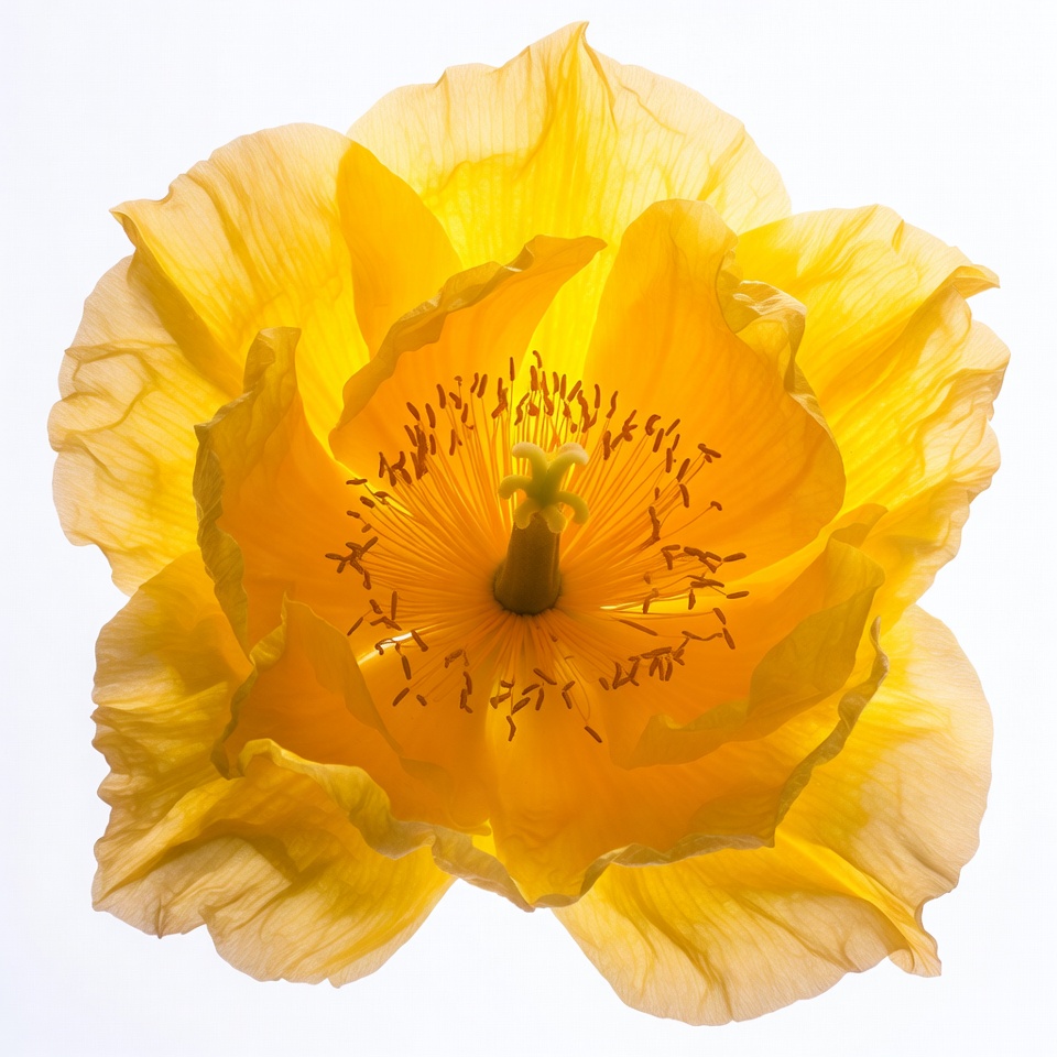A vibrant yellow poppy flower is captured in closeup against a white background. Its delicate, ruffled petals surround a central cluster of orange stamens and pistil. The petals exhibit translucent edges and fine veining.
