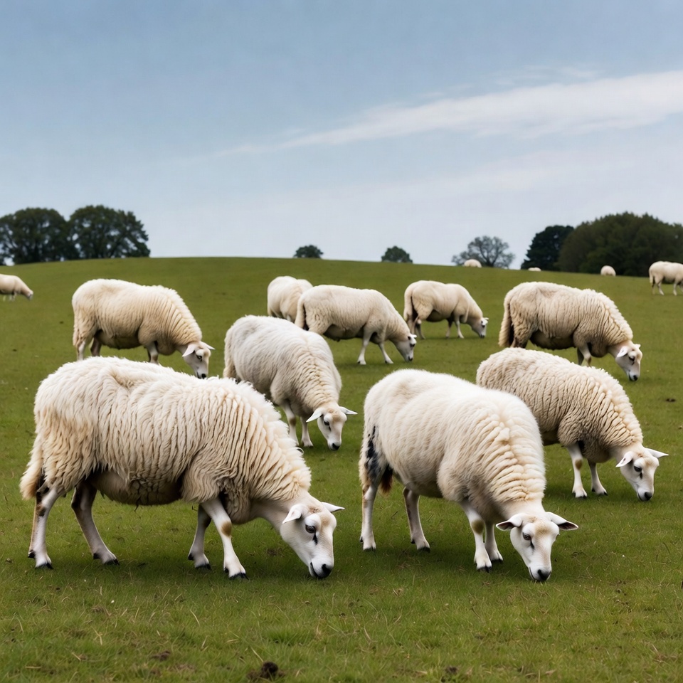 A large group of white sheep grazes on lush green grass covering a rolling hillside. They have thick wool and are positioned in a cluster, facing downward while eating. Scattered trees and a partly cloudy sky form the background.