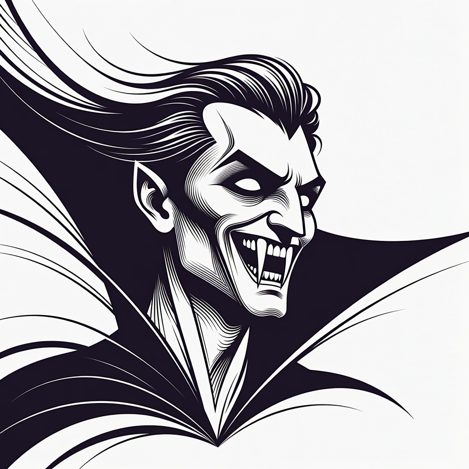 A black and white line art illustration depicts a menacing vampire with long flowing hair, pointed ears, and glowing eyes. He bares his sharp fangs in a fierce grin, wearing a high-collared cape with dramatic swirling edges. The design features bold outlines and dynamic shading on an isolated white background.