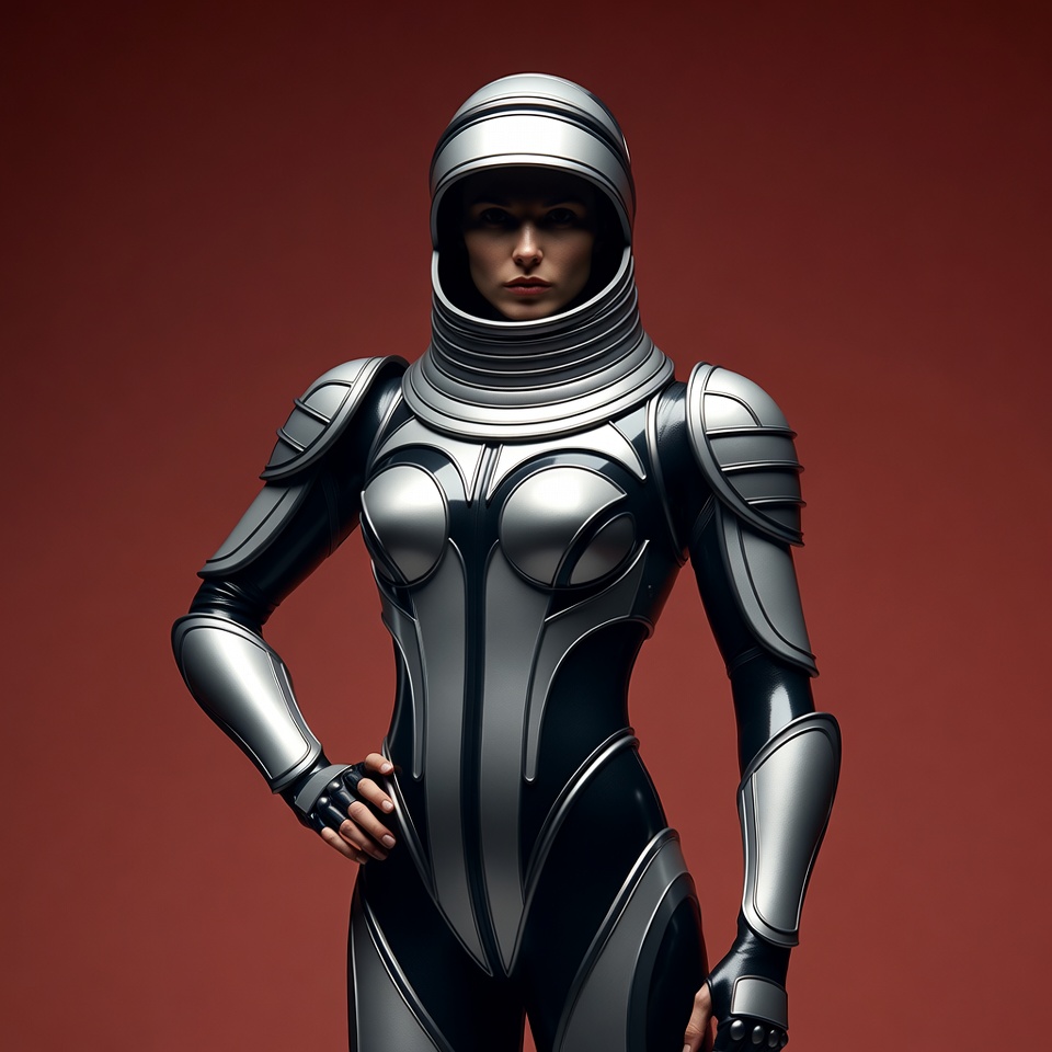 A woman stands confidently with hands on hips wearing a shiny silver futuristic spacesuit and helmet. The form-fitting armor features black accents, curved shoulder pads, and chest plating. She poses against a solid red background.