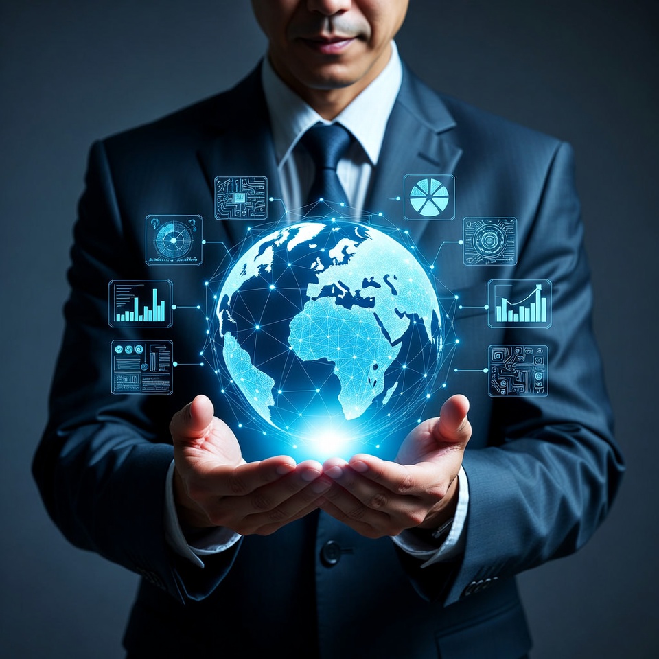 An Asian man in a dark suit holds a glowing digital Earth globe in his hands against a dark background. Holographic charts, graphs, networks, and data visualizations surround the globe. He stands confidently with a focused expression, emphasizing global business technology.