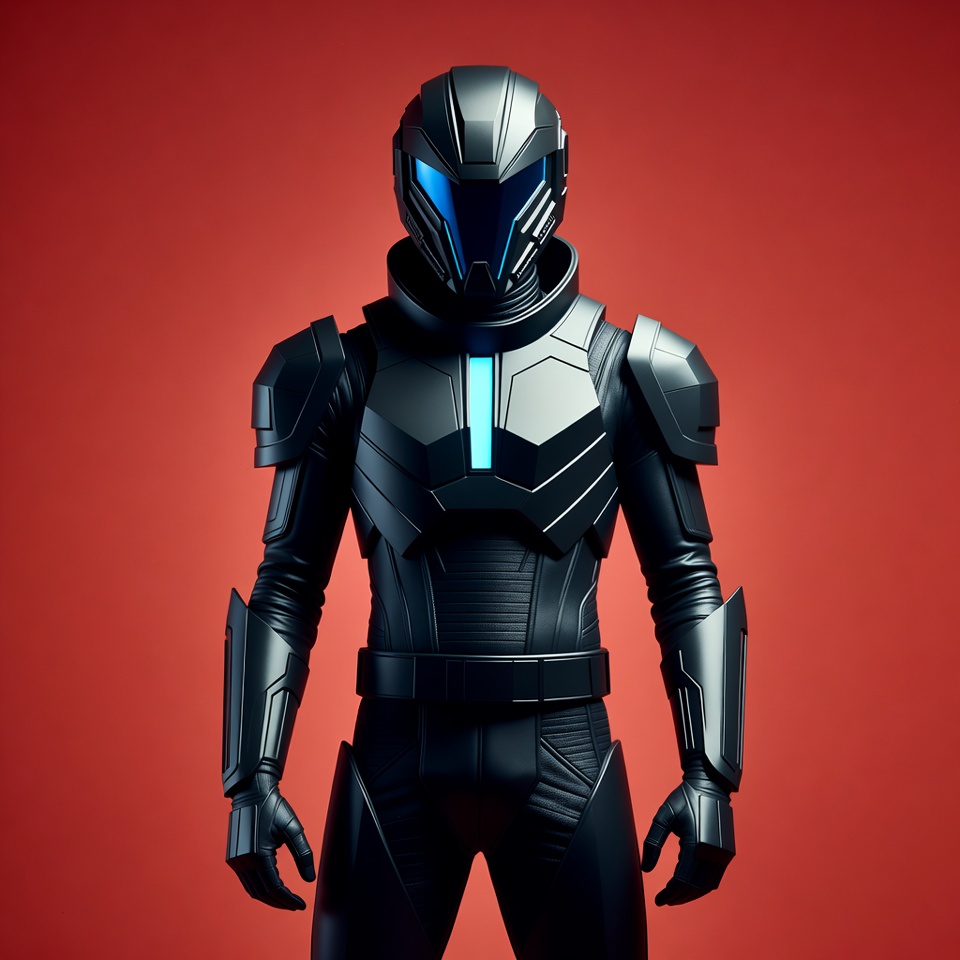 A humanoid figure in a sleek black futuristic spacesuit with glowing blue visor stands against a solid red background. The armor features angular designs, shoulder pads, and glowing blue accents on the helmet and chest. The figure poses confidently with gloved hands at its sides.