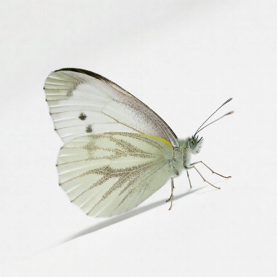 A delicate white butterfly with yellow markings and black spots rests with wings spread on a plain white background. Its wings feature intricate vein patterns and subtle brown edges. A small shadow appears beneath the butterfly.
