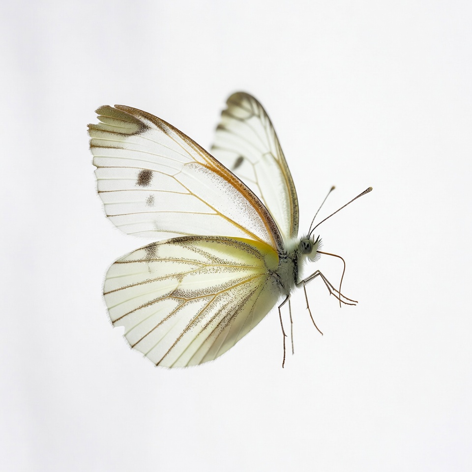 A delicate white butterfly with translucent wings and subtle yellow edges is captured in flight. Fine black dots and veins pattern its wings, and thin antennae extend from its head. It is isolated against a plain white background.