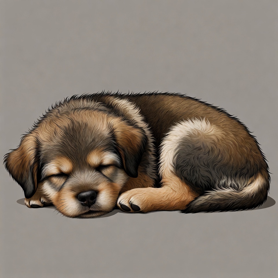A cute fluffy puppy with brown and white fur is sleeping curled up on a gray background. Its eyes are closed, paws tucked under, and tail relaxed in a peaceful pose. The digital illustration features soft fur details and a simple isolated background.