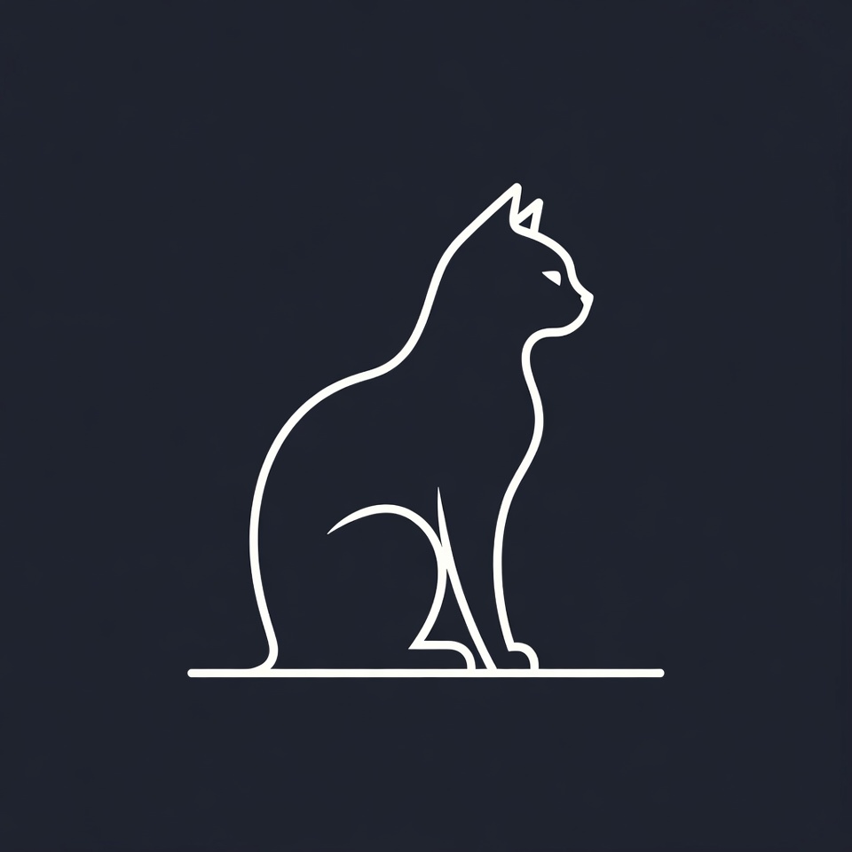 A minimalist white line art silhouette of a cat sits in profile on a dark navy background. The cat faces right with pointed ears, a curved tail, and detailed whiskers. The illustration features clean, simple outlines against an isolated solid background.