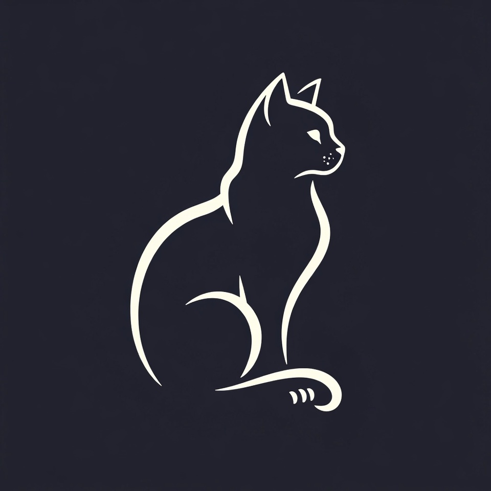 A minimalist white line drawing of a cat in profile sits against a dark navy background. The illustration features smooth outlines highlighting the cat's pointed ears, alert eyes, whiskers, and curled tail. It has a simple, elegant style suitable for logos or graphics.
