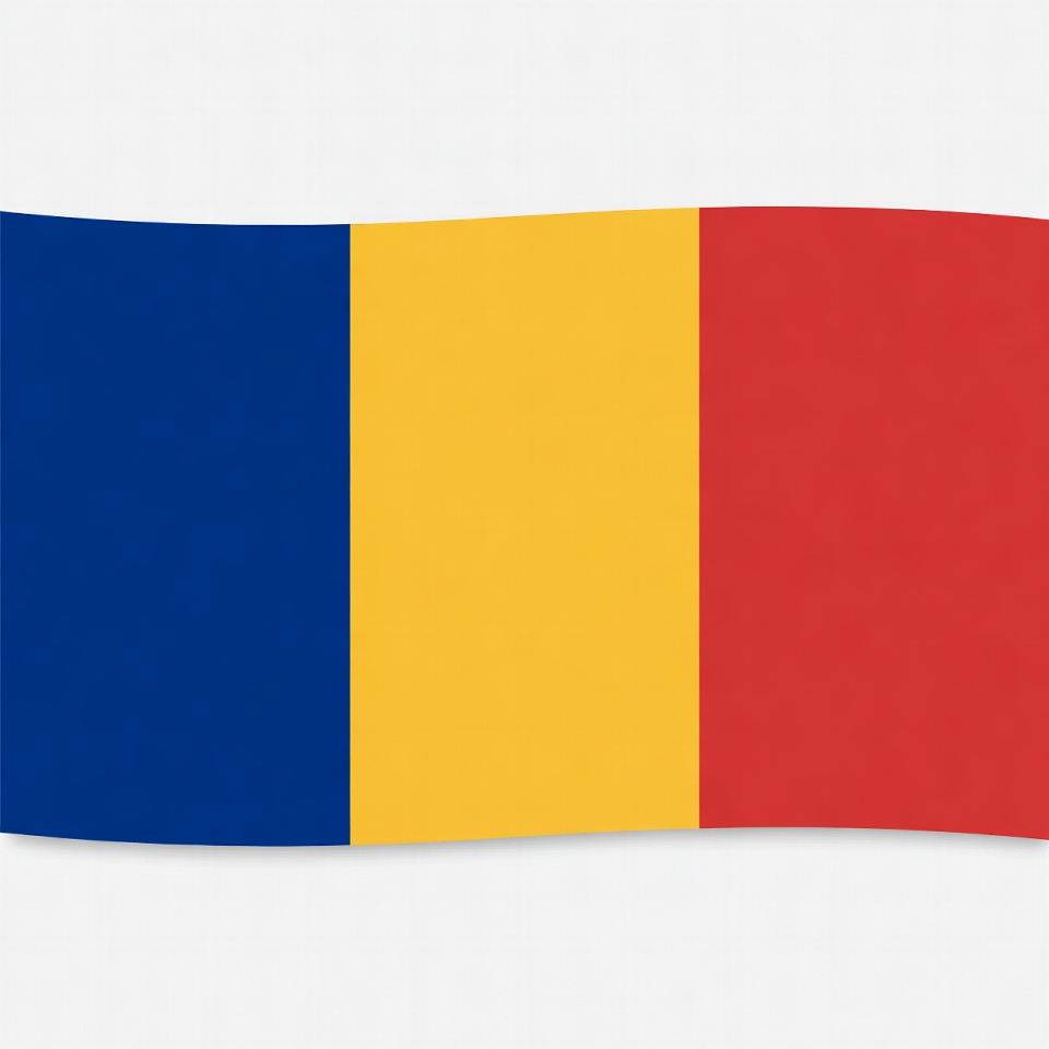 A vertical tricolor flag of Romania waves gently against a white background. It features deep blue on the left, bright yellow in the center, and vibrant red on the right. The flag has a realistic fabric texture with folds and shadows.
