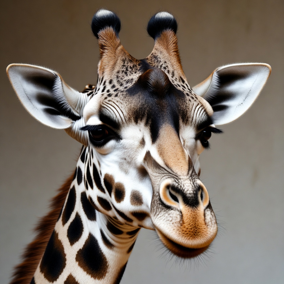 A giraffe's head is shown in close-up against a plain beige background. It features distinctive brown spots on a light coat, large ears, small horns, and expressive eyes. The giraffe looks directly at the camera with its muzzle slightly visible.