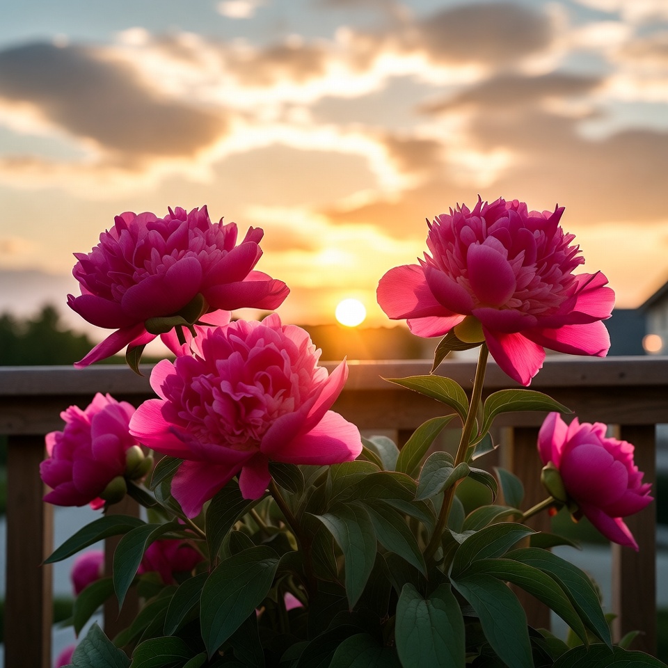 blooming flowers, blurred background, clouds, flower cluster, flowers, foliage, garden, green stems, nature, orange sun, outdoor, petals, pink flowers, pink peonies, railing, sky, summer flowers, sun, sunset, vibrant colors, wooden deck, peonies