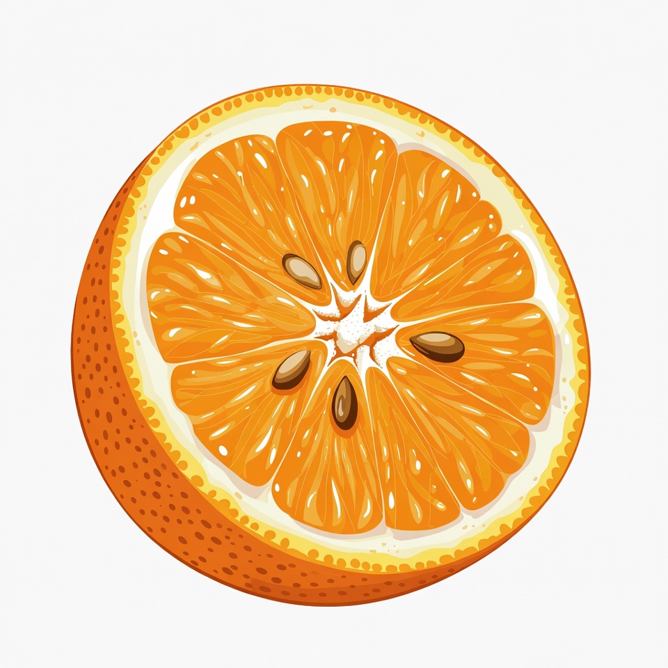 A vibrant orange fruit is sliced open, revealing juicy segments and small seeds inside. The illustration features a bright orange peel with textured rind and white pith. It is depicted on a plain white background.