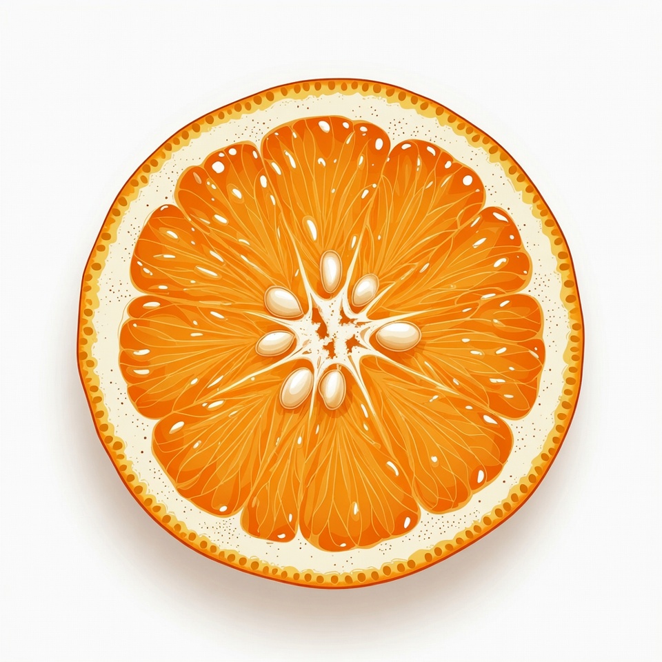 A vibrant illustration of an orange slice with juicy segments and white pith. The fruit is cut in half, revealing the segmented interior with small white seeds. It is depicted on a white isolated background.
