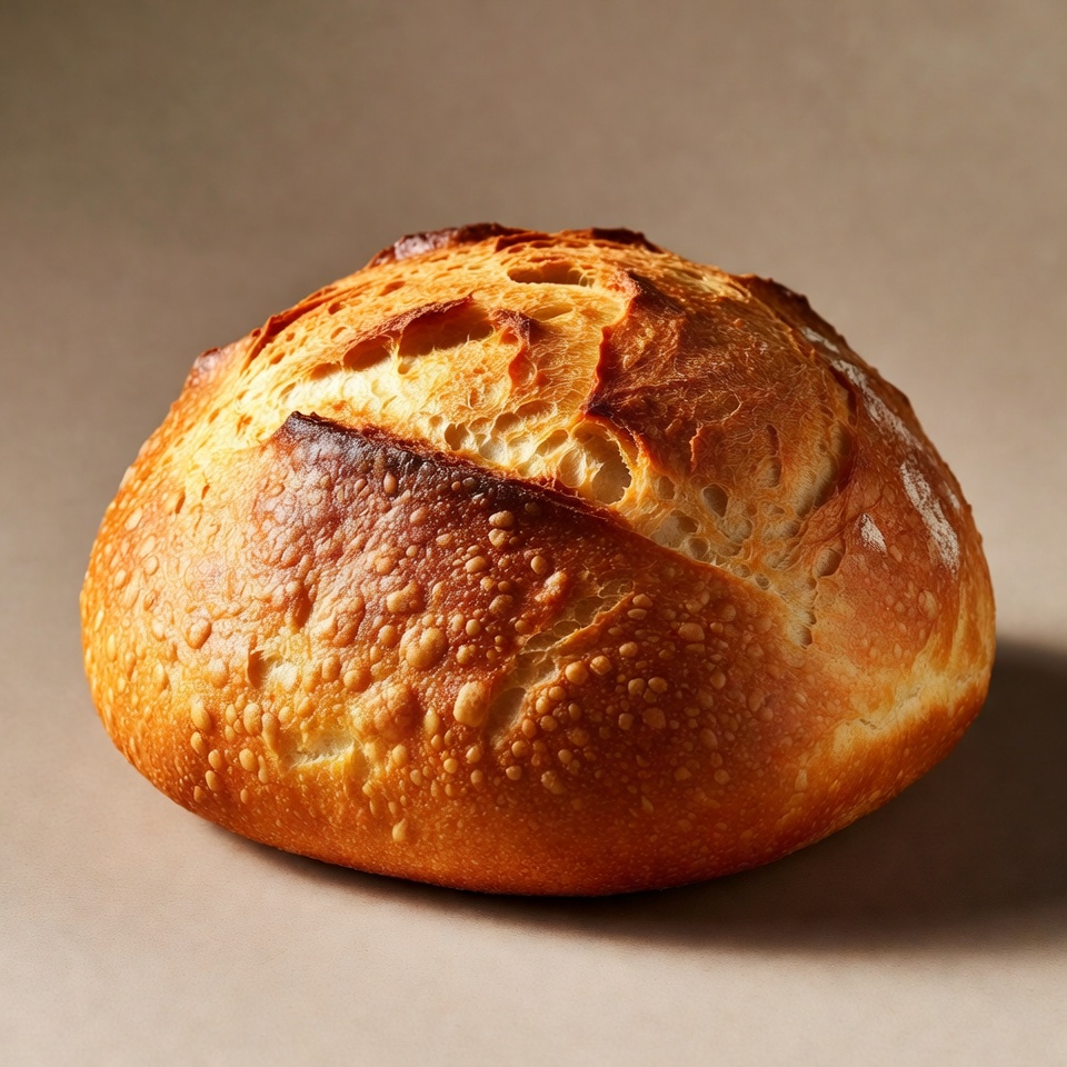 A golden-brown round loaf of bread sits on a neutral background. The crust is crispy with irregular cracks and flour-dusted texture. A deep slash runs across the top, revealing soft interior.