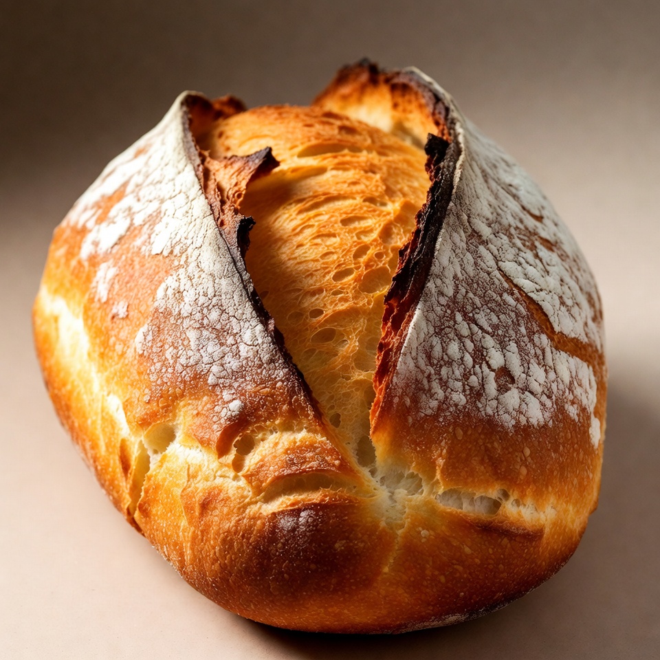 A rustic loaf of freshly baked bread with a golden-brown crust and white flour dusting sits on a neutral background. The bread features a distinctive split top revealing the textured interior. Crispy edges and soft flour highlights emphasize its handmade quality.