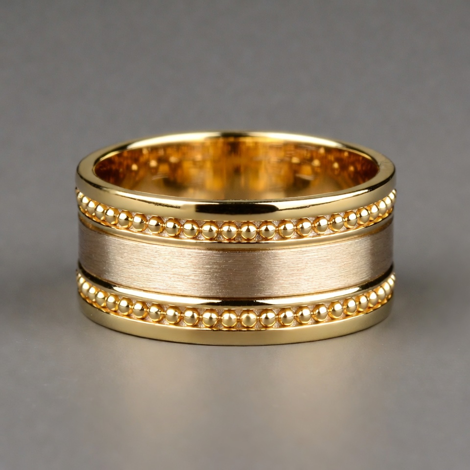 A gold wedding ring features a smooth brushed center band flanked by shiny gold edges adorned with small round beads. The ring is centered on a gray background, showcasing its two-tone texture and intricate detailing. The design emphasizes luxury and craftsmanship.