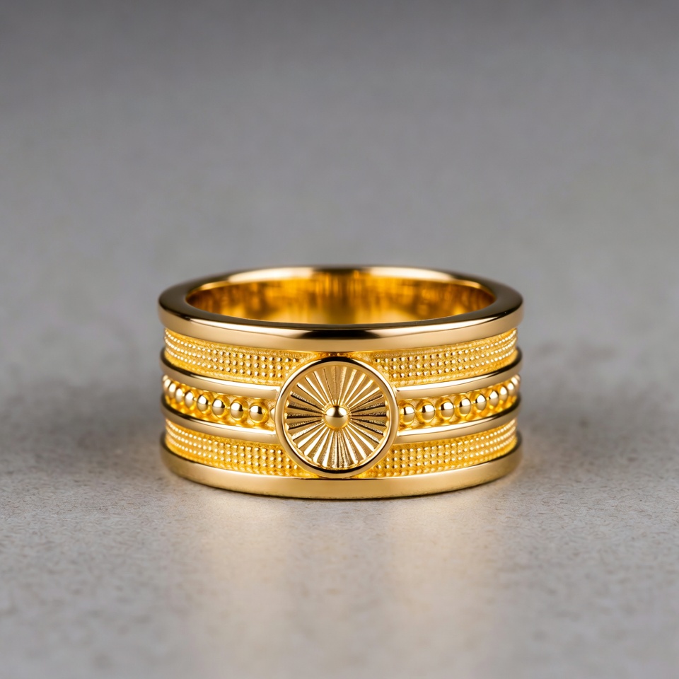 A shiny gold ring features three stacked bands with textured patterns and beaded edges. A prominent circular sunburst medallion sits in the center of the middle band. The ring is displayed against a smooth gray background.
