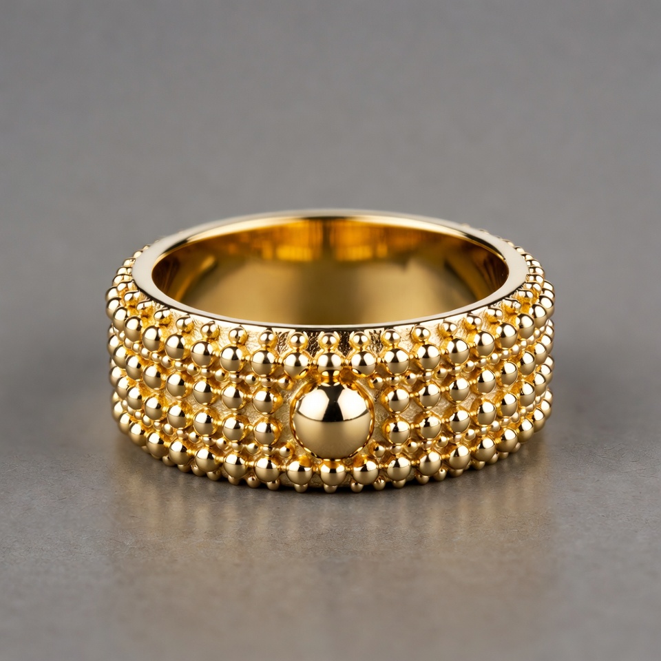 A shiny gold ring features a wide band covered in small spherical beads. A larger central bead sits prominently on the front. The ring is displayed against a smooth gray background.