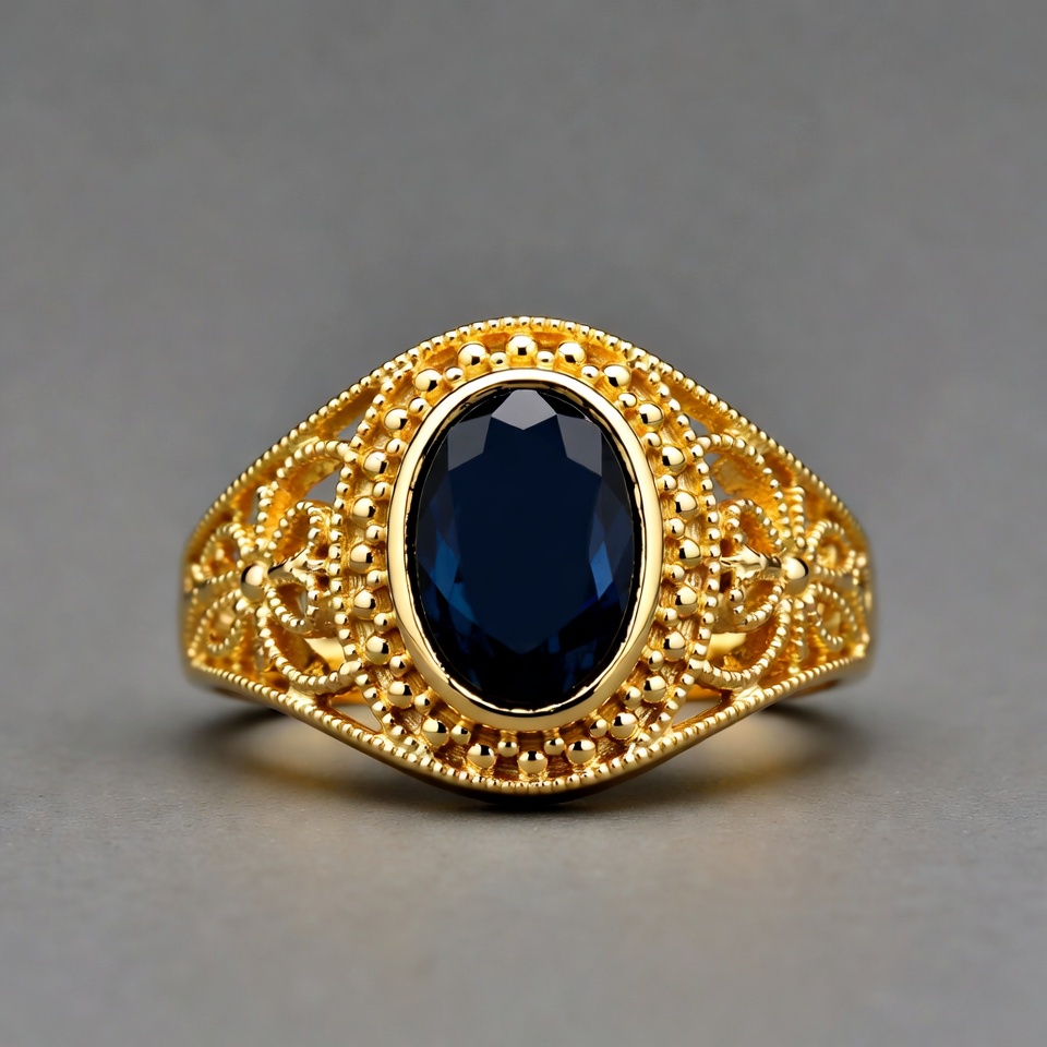 A close-up view of an ornate gold ring featuring a large oval-cut deep blue sapphire gemstone. The ring has intricate filigree detailing and beaded edges surrounding the faceted stone. It is displayed against a plain gray background.